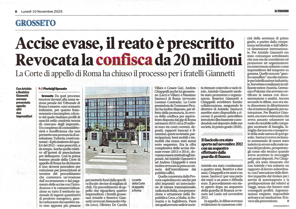 ACCISE EVASE, IL REATO E’ PRESCRITTO. REVOCATA LA CONFISCA DA 20 MILIONI
